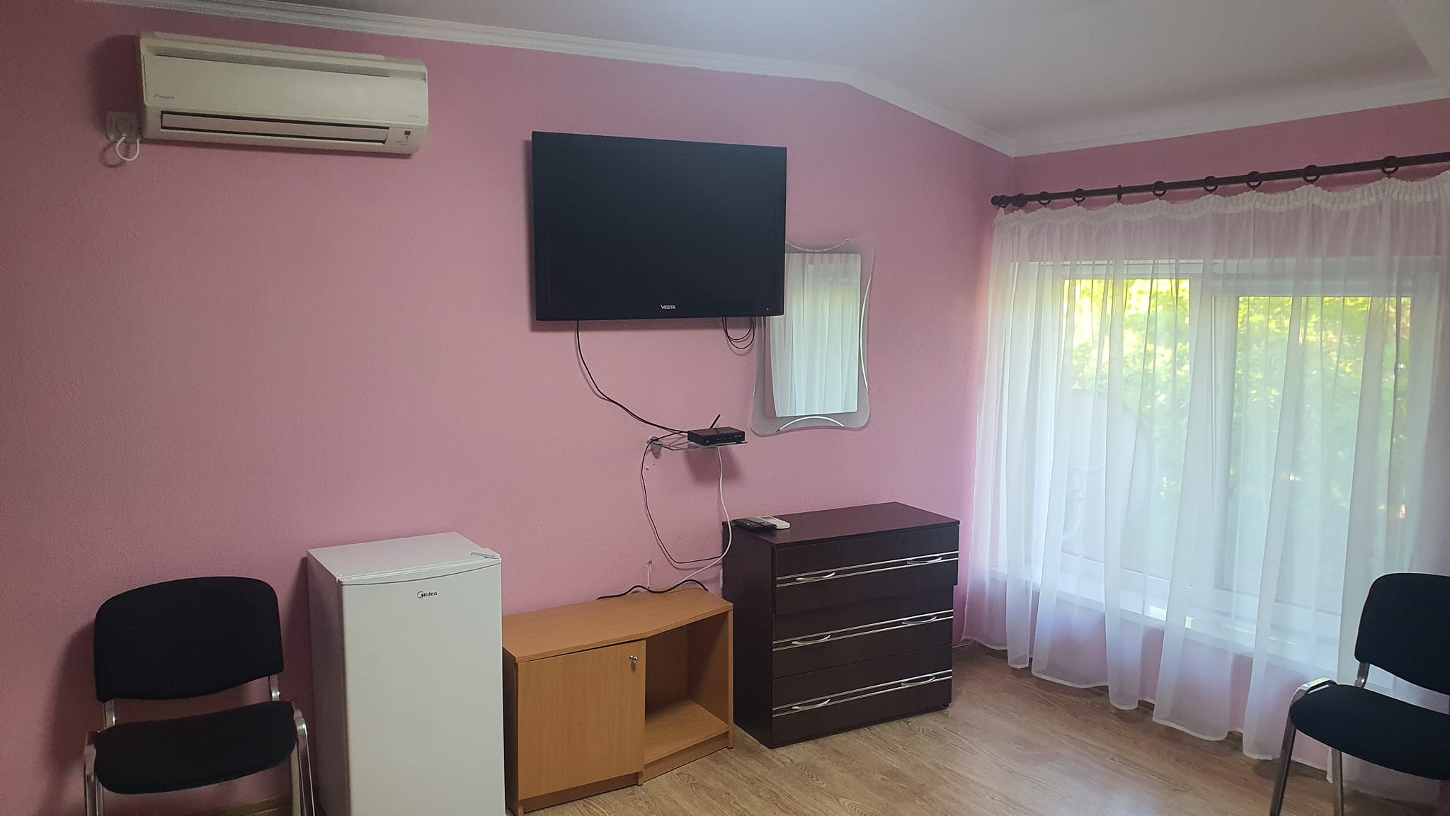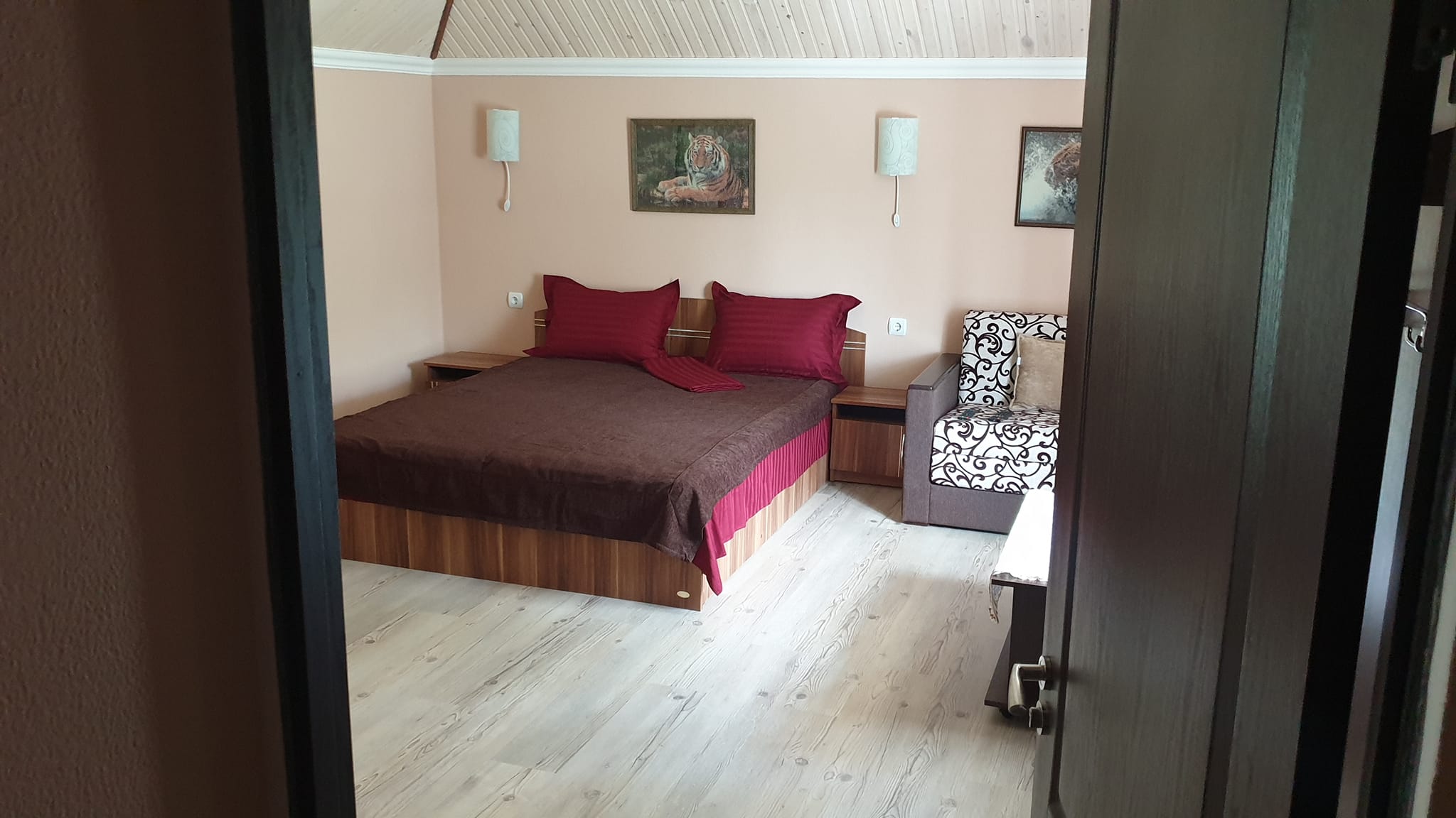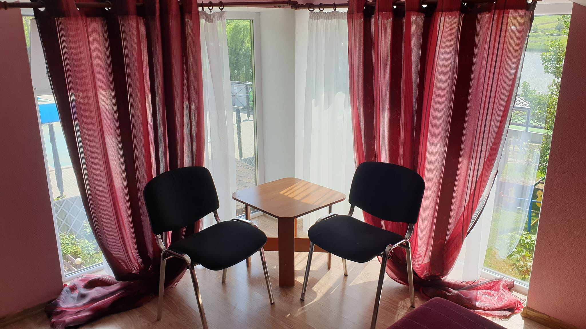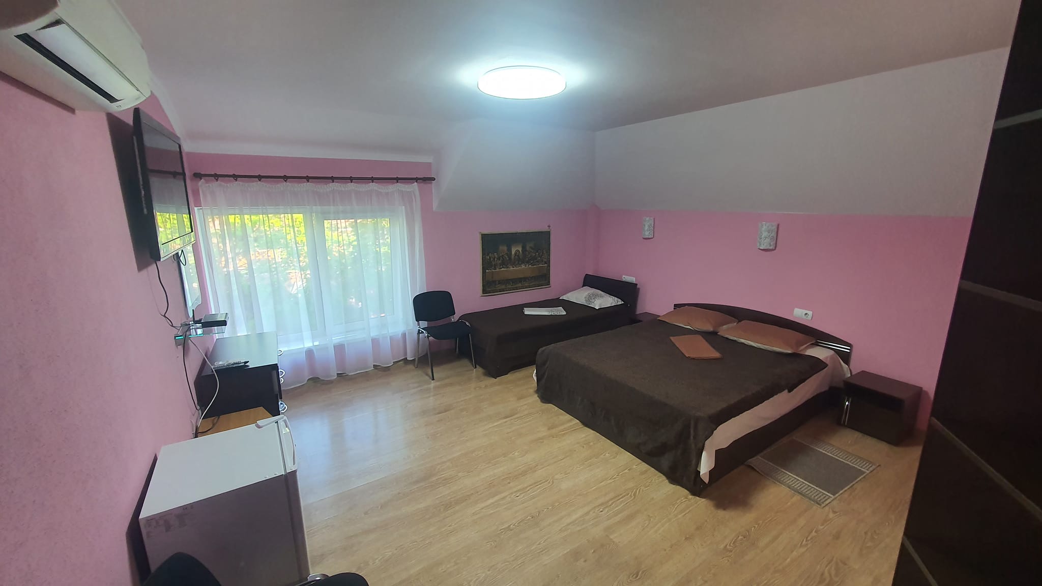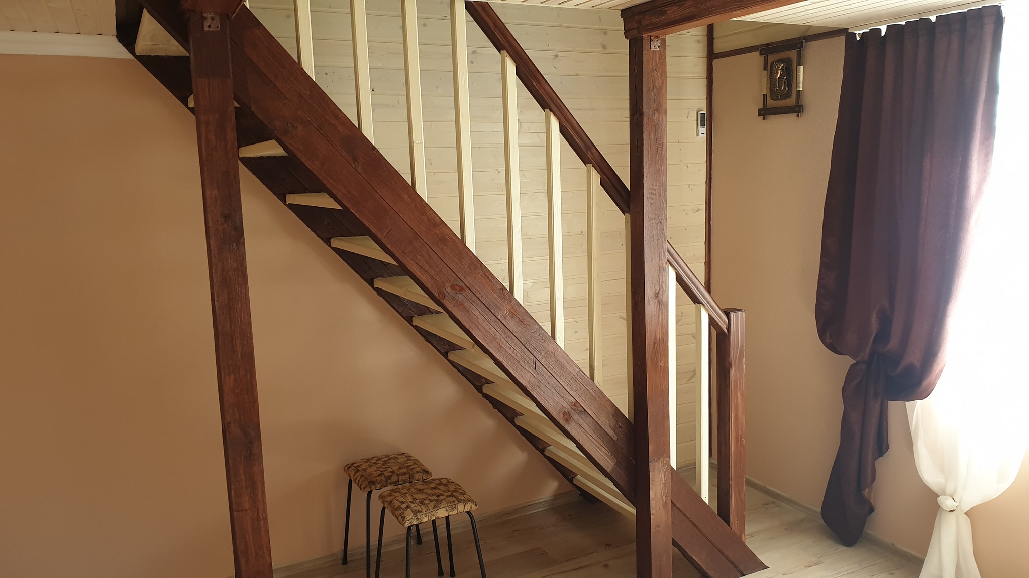 Etajul doi — dormitor (2 persoane) și fotoliu care se extinde, TV, aer condiționat. Etajul unu — canapea pentru două persoane, frigider, aer condiționat, baie, WC, măsuță. Afară terasă pentru 6 persoane cu grătar și plasă pe grătar. Copii până la 5 ani gratis (nu necesită loc de dormit).