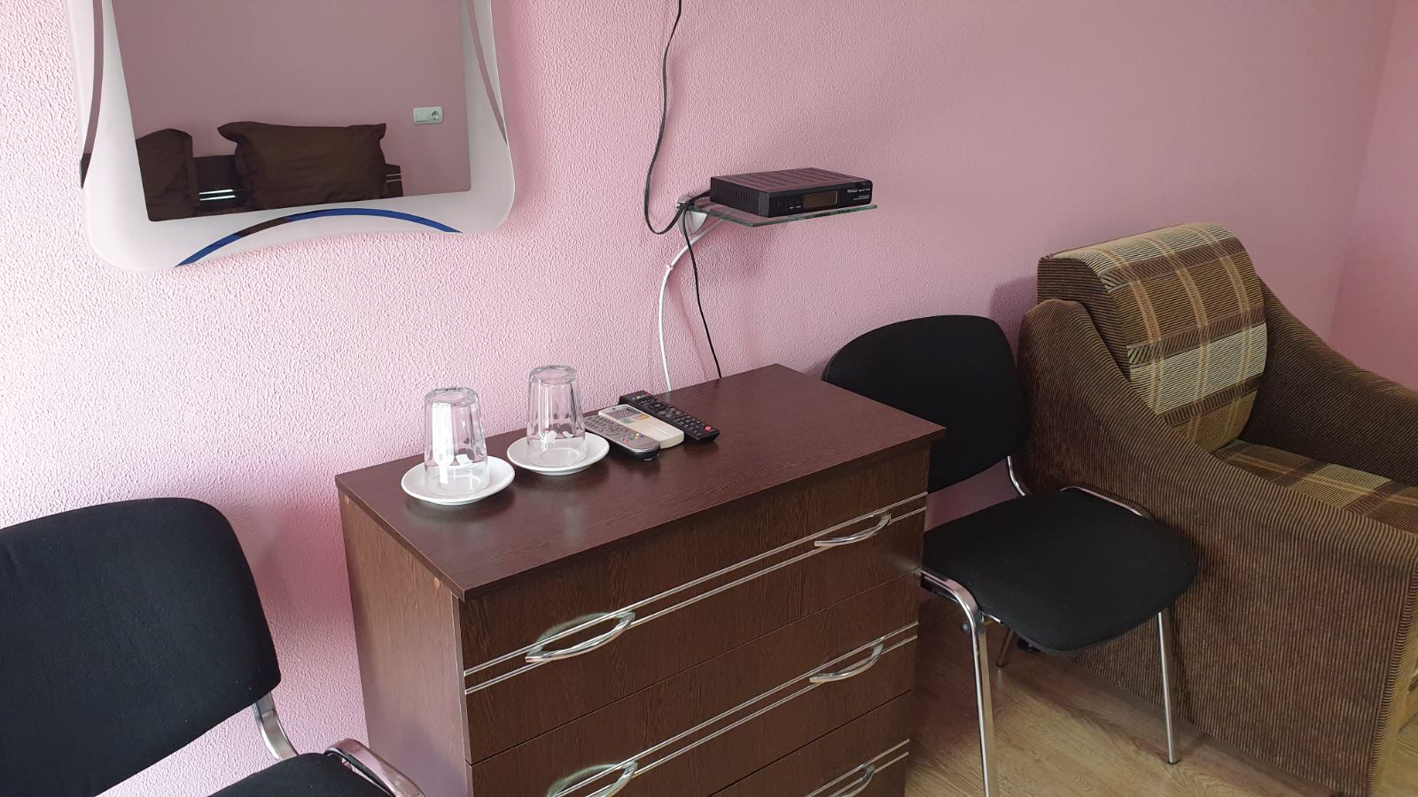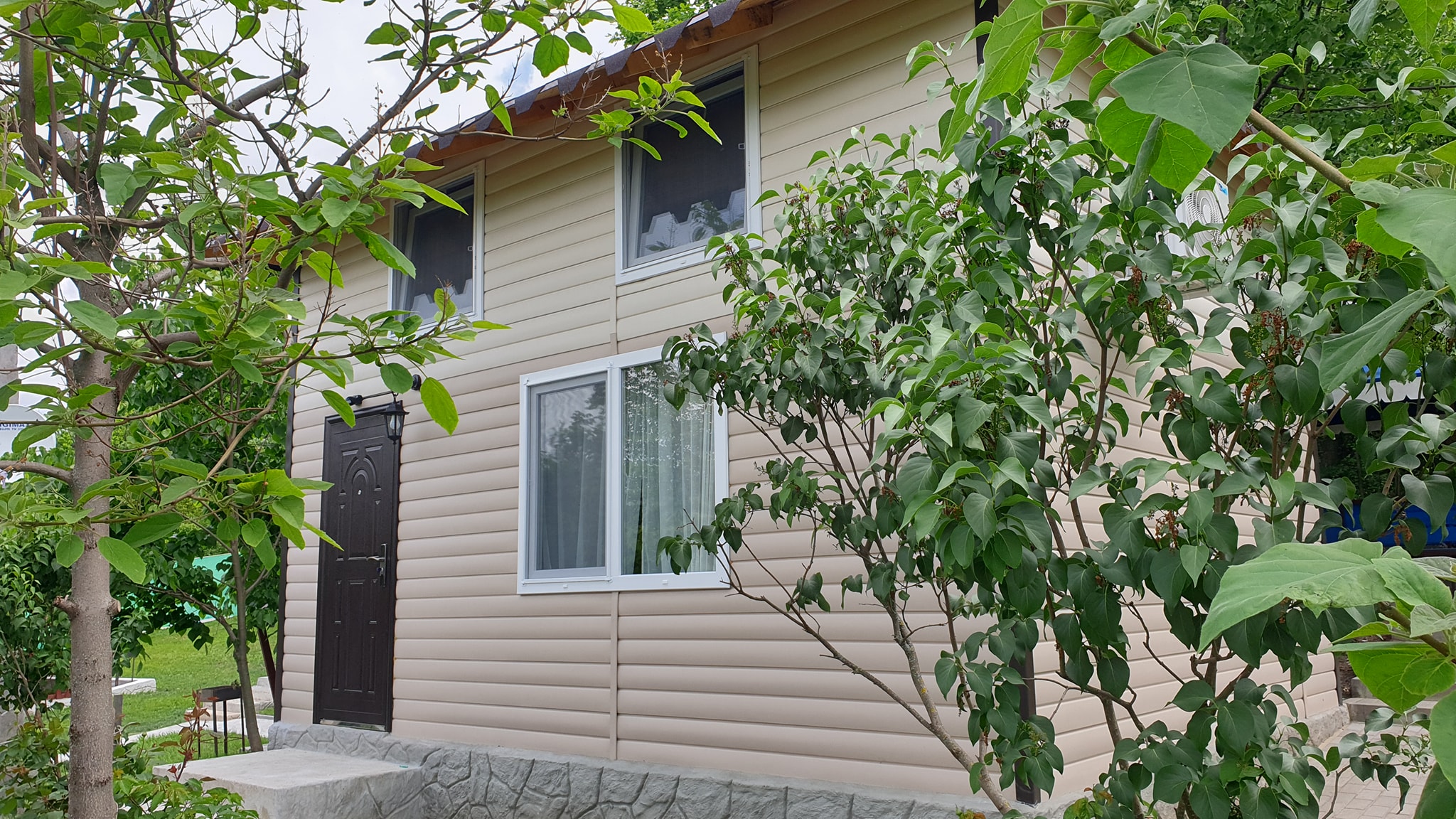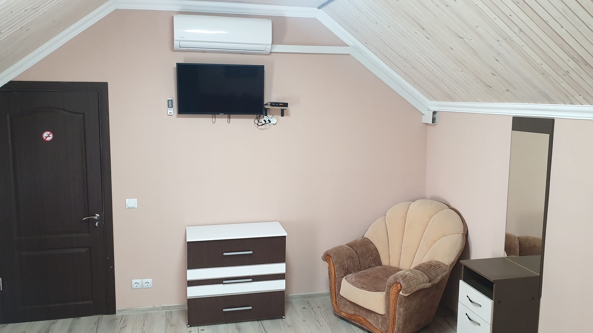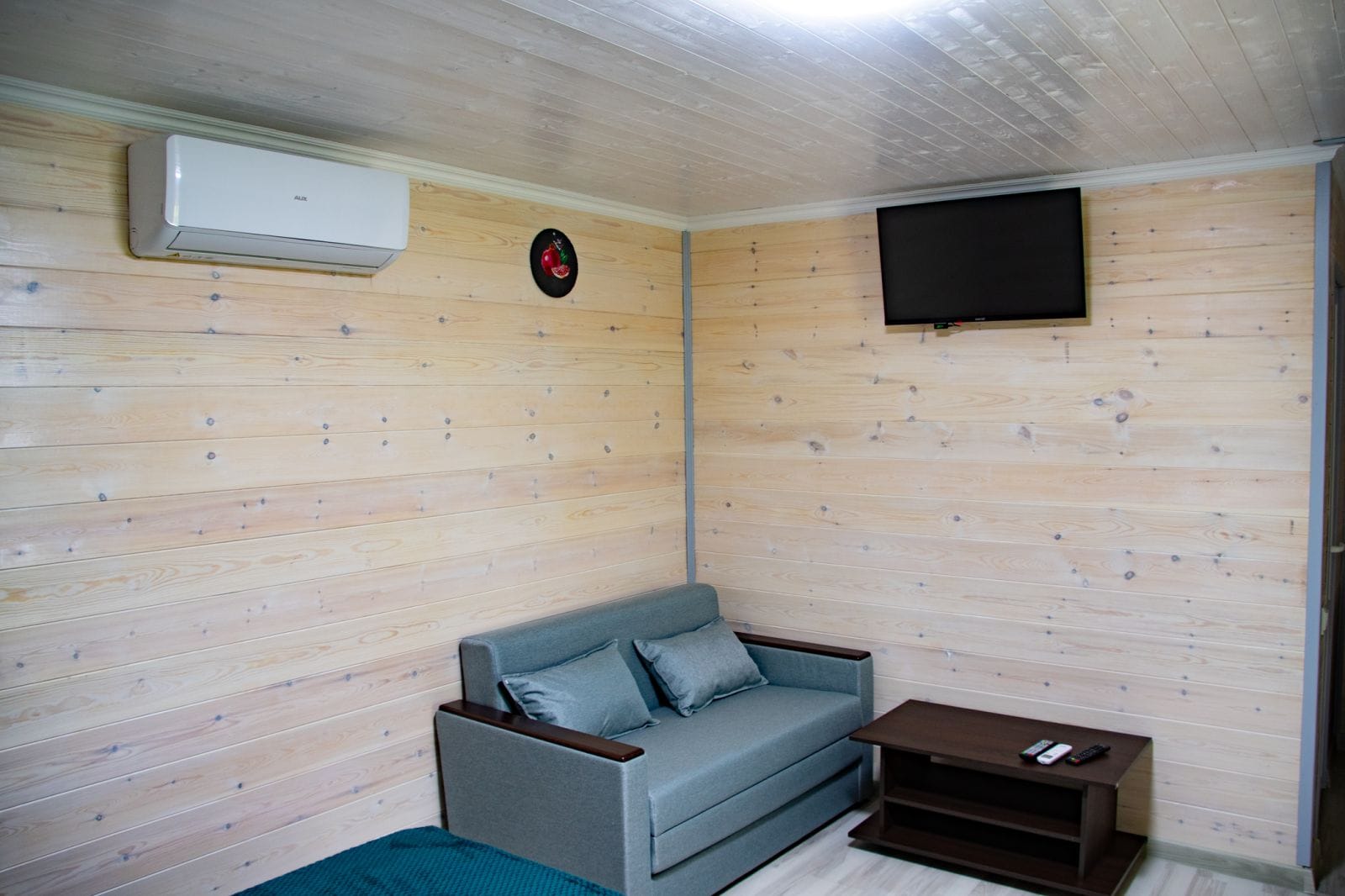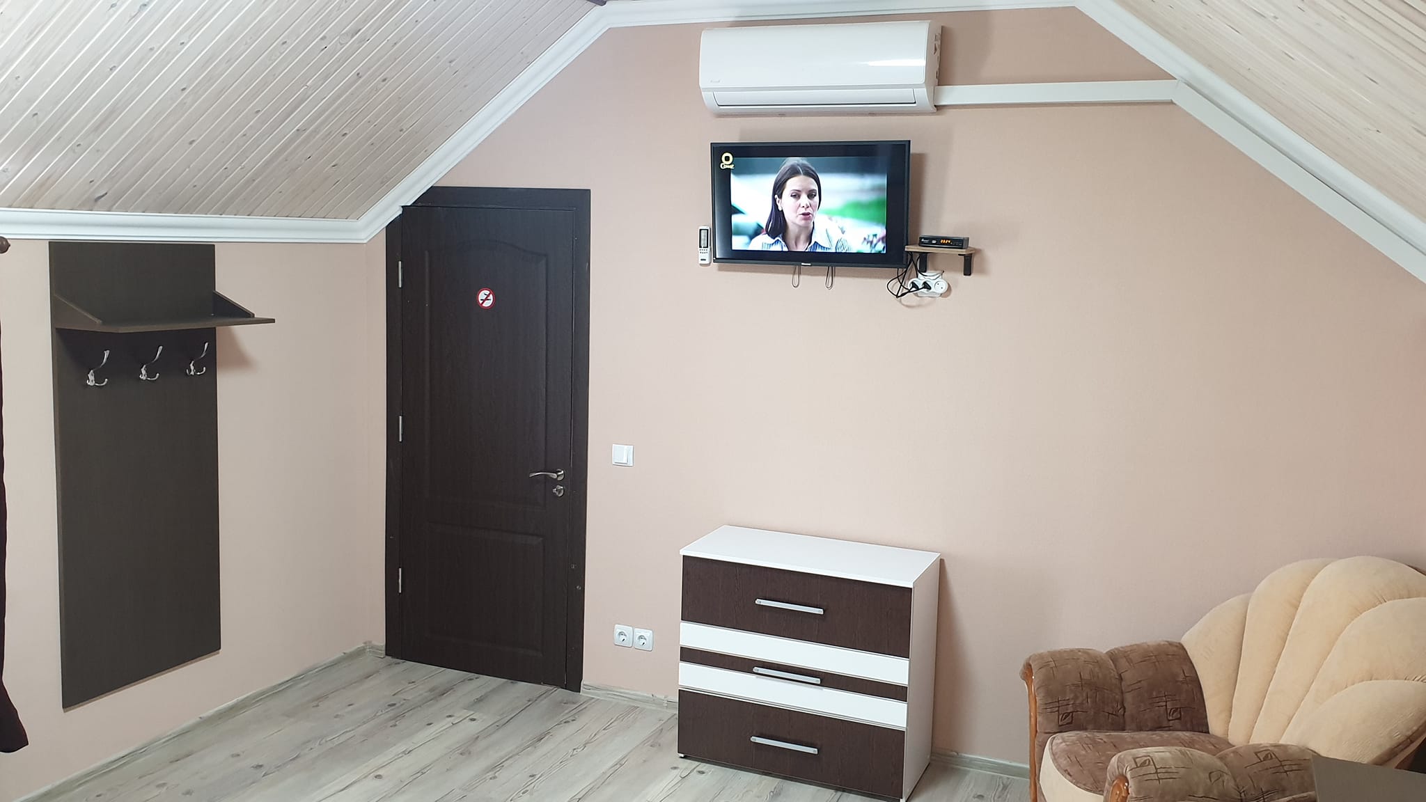 Etajul doi — dormitor (2 persoane) și fotoliu care se extinde, TV, aer condiționat. Etajul unu — canapea pentru două persoane, frigider, aer condiționat, baie, WC, măsuță. Afară terasă pentru 6 persoane cu grătar și plasă pe grătar. Copii până la 5 ani gratis (nu necesită loc de dormit).